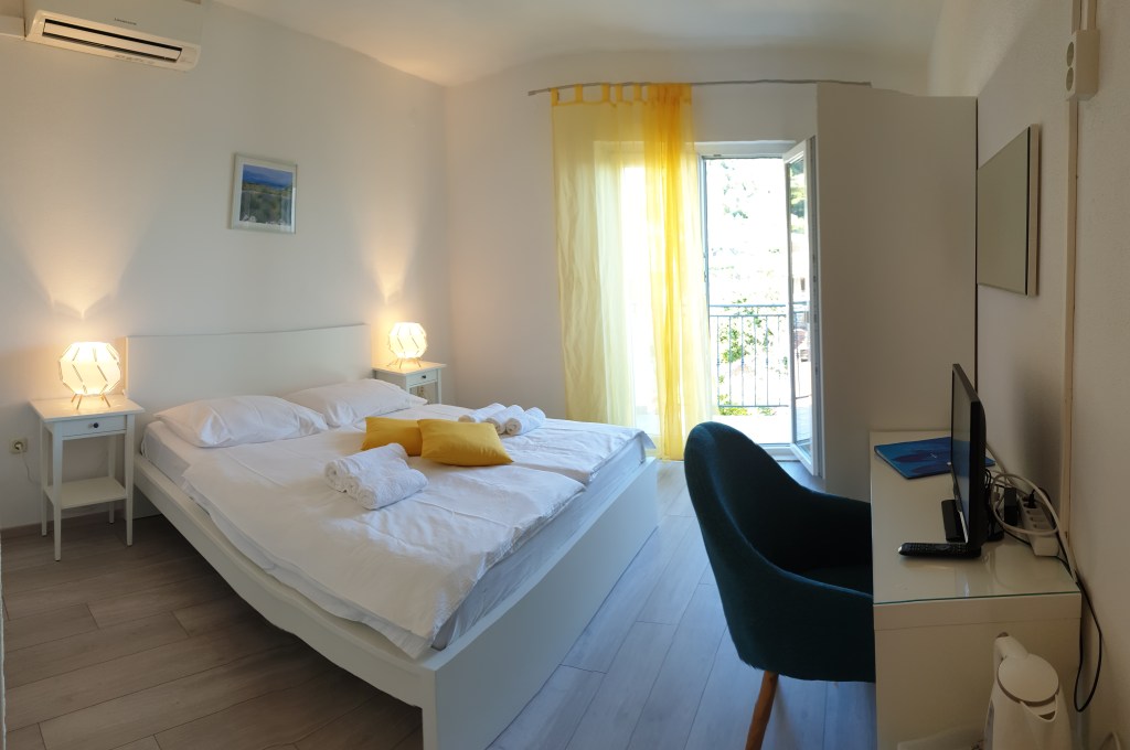 Sve naše sobe uključuju vlastitu kupaonicu s tuš kabinom, te balkon s pogledom na more i/ili vrt. Sve sobe su klimatizirane, te imaju TV, frižider, kuhalo za kavu/čaj, sušilo za kosu, ručnike te higijenske potrepštine. Sve sobe također imaju besplatan WIFI. Parking je besplatan i osiguran u neposrednoj blizini pansiona.